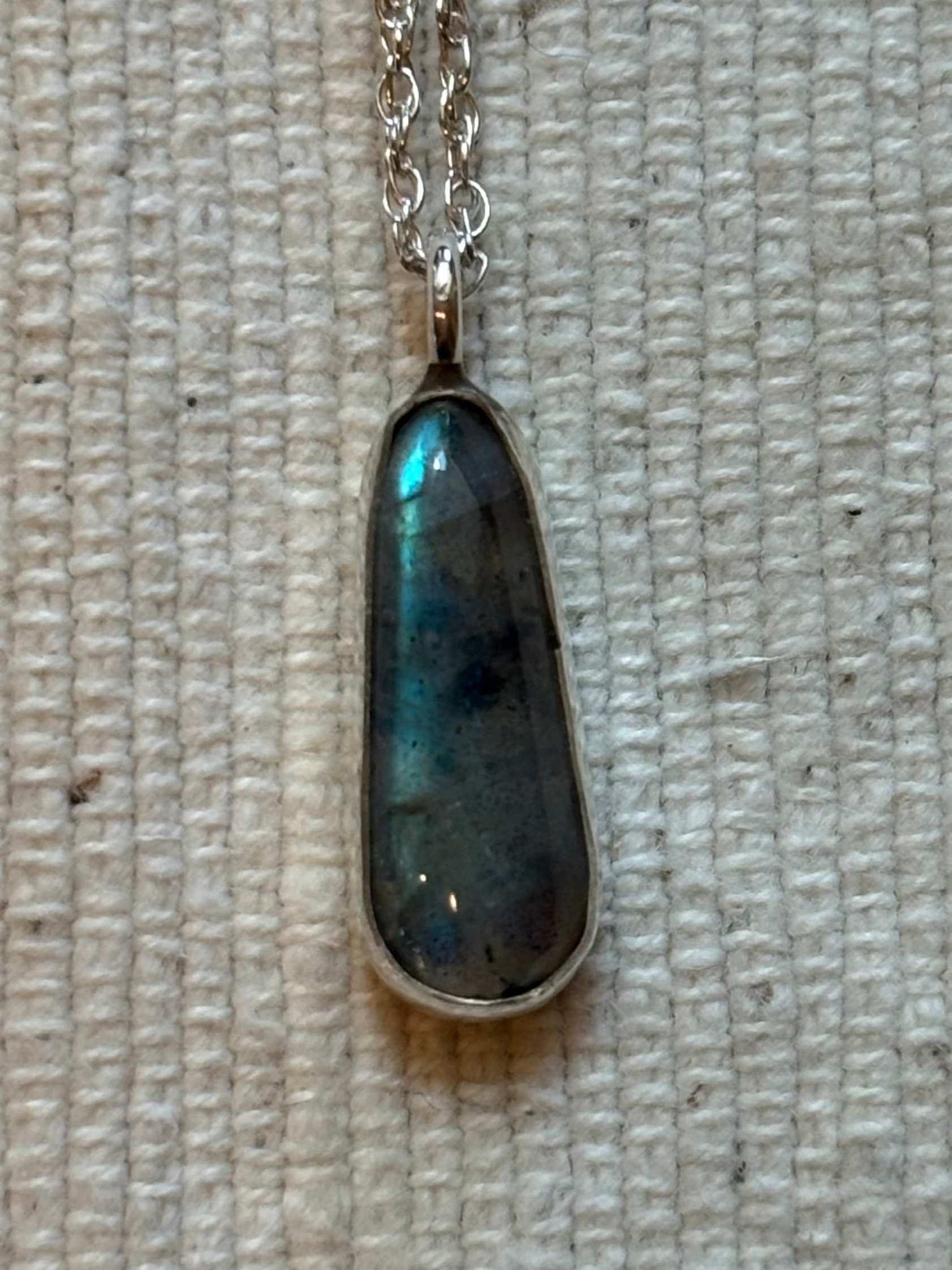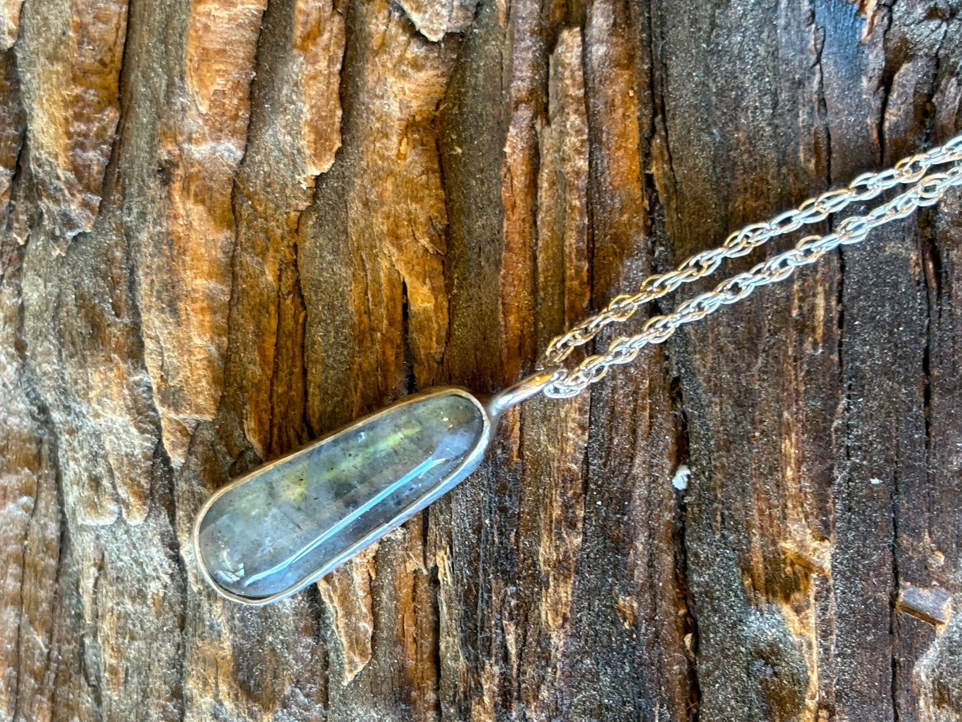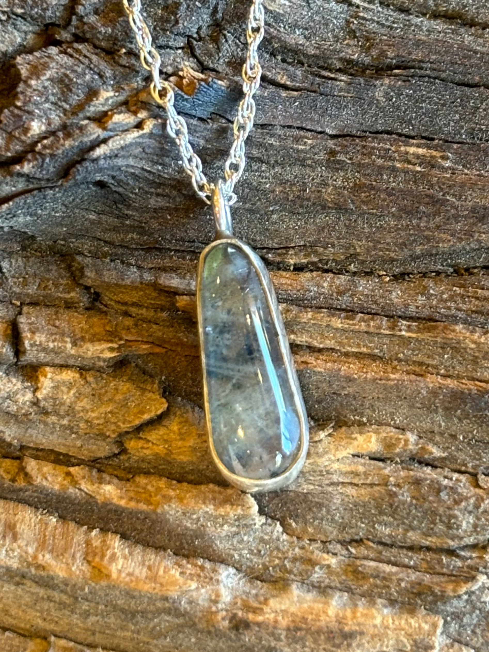 This beautiful reflective blue labradorite necklace is 4 ct, and 6.5 x 18.5mm in size. It is hand cut and polished in Travel Ore Designs Fort Collins jewelry studio. The silver is artistically done by hand in a simple setting to make the iridescent of the stone shine.