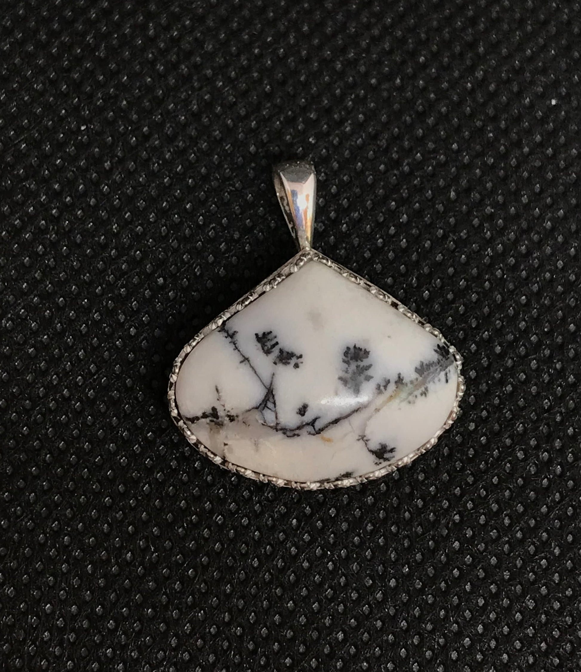 This beautiful Oregon Amethyst Sage Agate pendant is a white stone with a beautiful black/ gray branch reaching across the piece. This branch design is in the rock, placed by God in nature and has been cut and polished in such a way to present an art piece on this pendant. It is really stunning for anyone who enjoys art and would love to wear it.